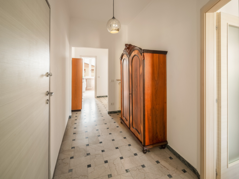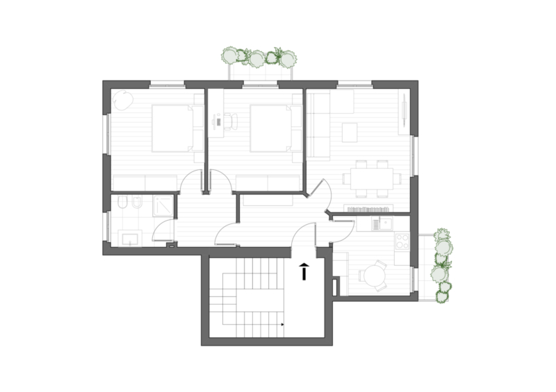 L’appartamento è composto da due camere da letto, un bagno, un accogliente soggiorno, una cucina separata e un generoso corridoio. Due piccoli balconi offrono spazio per un tavolino da colazione o qualche pianta, creando un piacevole collegamento tra interno ed esterno.