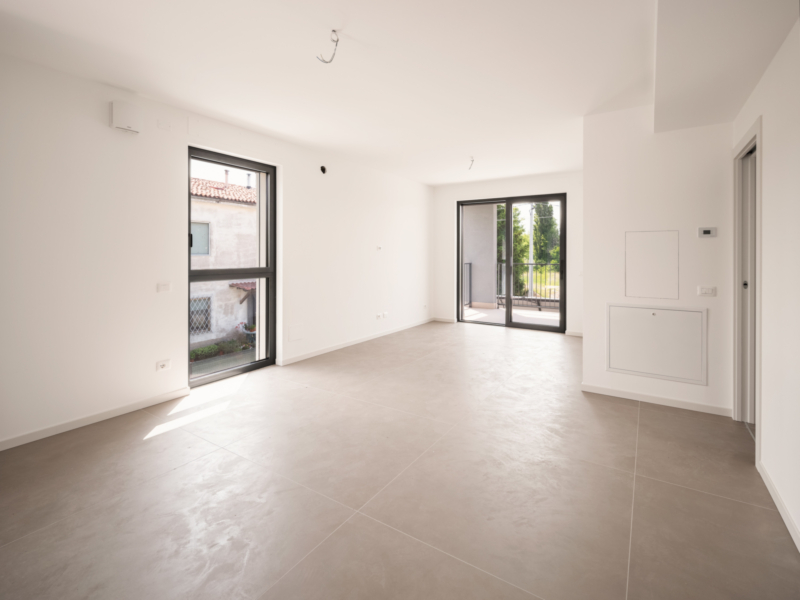 Al piano terra gli appartamenti sono composto da una grande zona giorno vetrata con accesso al giardino privato e al grande terrazzo lastricato, un bagno finestrato con doccia una camera matrimoniale e una seconda camera.