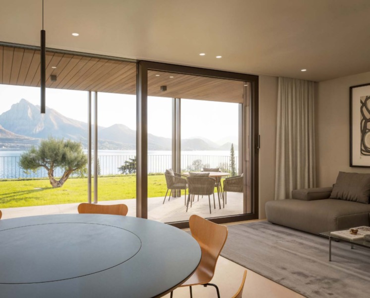 L’architettura moderna si inserisce con eleganza nell’armonioso pendio verde, valorizzando la posizione sopraelevata con ampie vetrate e spazi esterni perfettamente orientati, che regalano una vista lago mozzafiato.