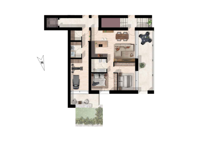 Questo esclusivo appartamento con terrazza offre una zona giorno con cucina a vista, due camere da letto e un bagno. Un ulteriore spazio versatile – attualmente previsto come area fitness – dispone di un secondo bagno e si presta idealmente anche come zona ospiti o studio. L’ampia terrazza offre spazio per il relax e crea una piacevole continuità tra interno ed esterno.