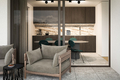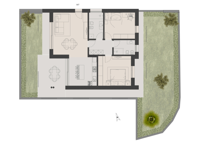 Il trilocale, con ampio giardino e terrazza ideale per pranzi e relax, dispone di un ampio soggiorno con cucina a vista tipo open-space.