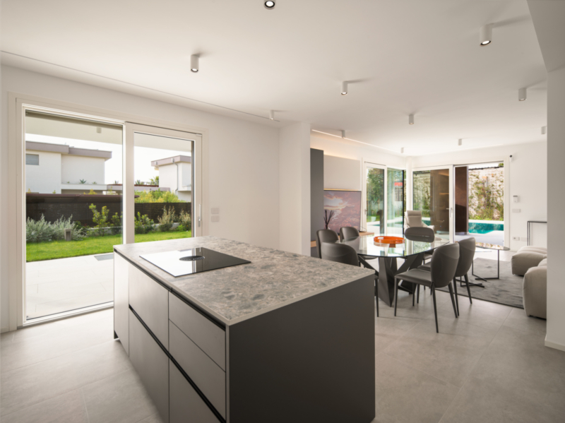 Al piano terra troverete un ampio soggiorno luminoso con grandi vetrate che offrono molta luce naturale, e una zona pranzo aperta su una cucina moderna. Un bagno per gli ospiti e una veranda angolare con vista sulla piscina completano questo livello.