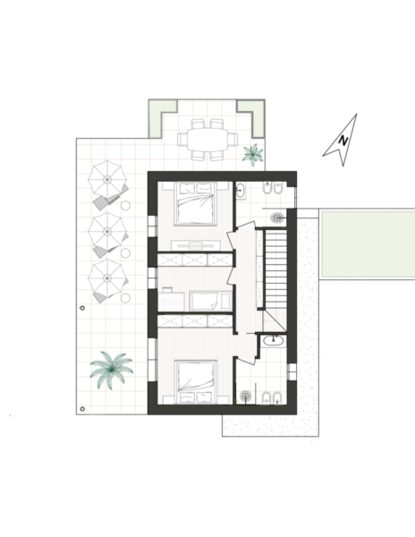 Al primo piano ci sono tre camere matrimoniali, ognuna con accesso a una terrazza parzialmente coperta. Due lussuosi bagni sottolineano l’alto standard della villa.