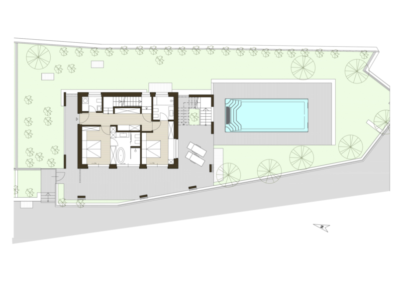 Il piano terra è composto da due camere da letto, entrambe con bagno en suite, oltre a un ulteriore bagno separato. Da questo livello si accede direttamente alla terrazza con giardino e piscina privata, creando una perfetta continuità tra spazi interni ed esterni.