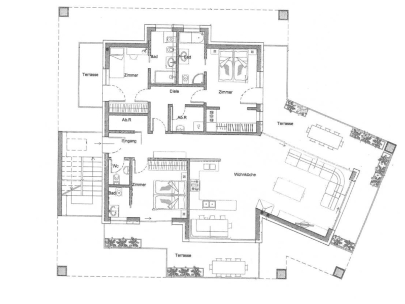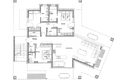 - Piano terra: unità abitativa con ingresso, cucina-soggiorno, WC diurno, disimpegno, due ripostigli e tre camere da letto, ognuna con bagno e accesso alle terrazze.