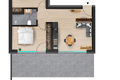 L’unità è composta da due camere da letto, un bagno moderno e una zona giorno open space con cucina integrata. Le ampie superfici vetrate garantiscono ambienti luminosi e creano un collegamento diretto con la spaziosa terrazza.