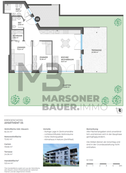 Le ampie terrazze coperte e il giardino privato di questo appartamento trilocale - unità n.5 - di nuova costruzione che proponiamo in vendita, permettono una vita anche all'aperto. Godetevi le numerose ore di sole all'aperto o negli ambienti inondati di luce, grazie all'orientamento ottimo al sole a sud e alle numerosi vetrate. I materiali naturali, una finitura in standard CasaClima A Nature, dotazioni di alta qualità unite a design e architettura moderni, creano un'atmosfera abitativa molto speciale. Oltre alle aree verdi che circondano il complesso residenziale, le fioriere integrate sulle terrazze aggiungono più natura e garantiscono la privacy. Finiture di alta qualità, come i pavimenti in vero legno e le piastrelle moderne, promettono un design senza tempo. L'arredamento del bagno prevede sanitari di qualità. Le porte a filo muro con cerniere a scomparsa e maniglie di design trasmettono una piacevole sensazione ogni volta che si entra. Nelle zone giorno sono installate tende a pacchetto a regolazione continua, mentre le camere da letto e i bagni sono oscurati da tapparelle. Materiali da costruzione durevoli e una costruzione di alta qualità gettano le basi per la sostenibilità. Il collegamento alla rete di teleriscaldamento si traduce in costi di manutenzione significativamente ridotti. Il riscaldamento a pavimento garantisce una distribuzione piacevole del calore e il recupero del calore assicura un bilancio energetico ottimale. La ventilazione meccanica controllata garantisce il ricambio dell'aria fresca senza inutili dispersioni di calore. È stata data grande importanza a un'acustica efficace per un'esperienza abitativa tranquilla. Sono state prese diverse disposizioni in fase di costruzione per personalizzare la vostra casa e, su richiesta, per equipaggiarla con un sistema di allarme, un sistema di climatizzazione, una smart home o una stazione di ricarica per veicoli elettrici.