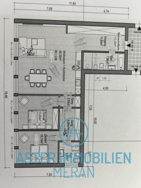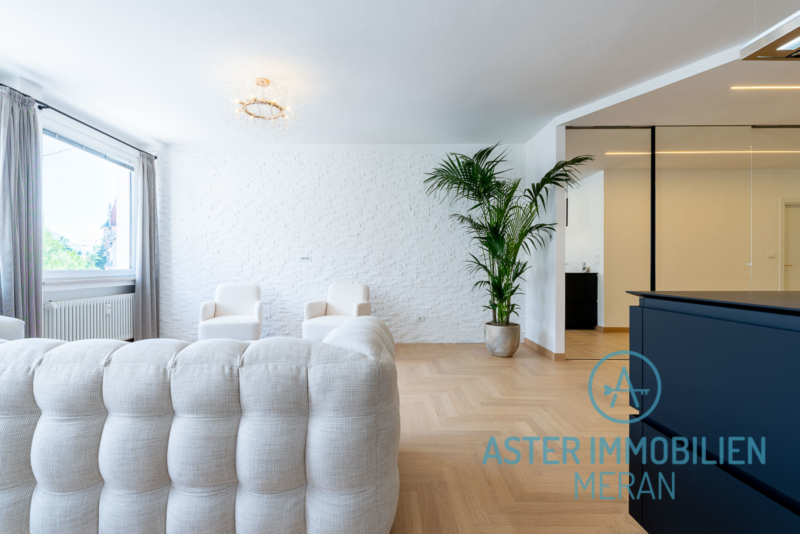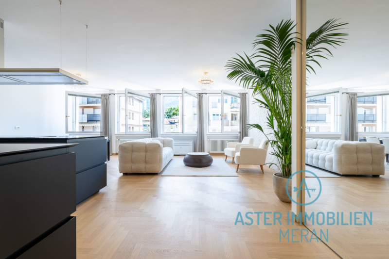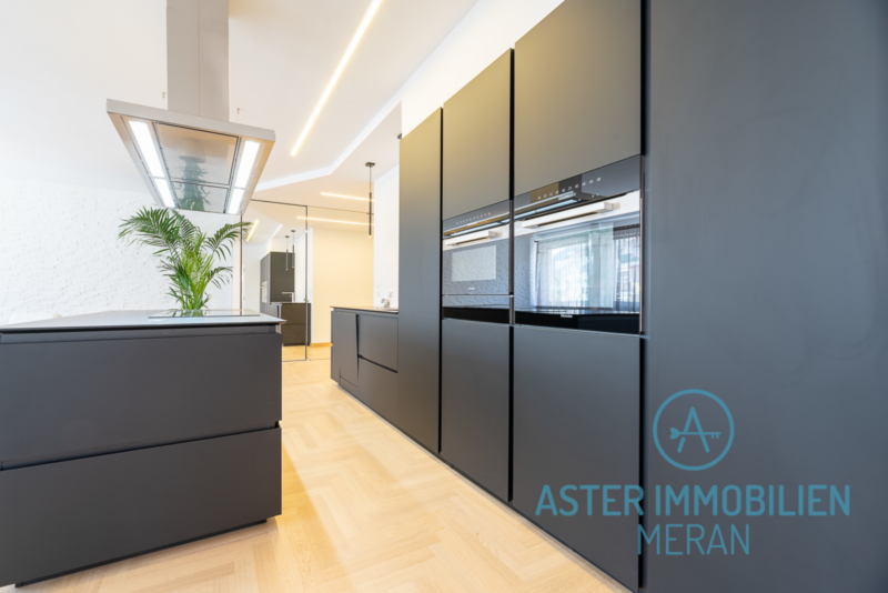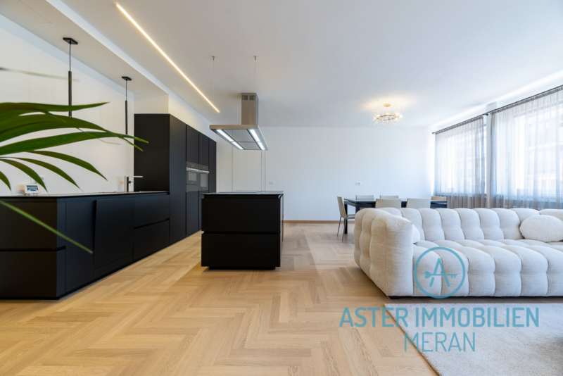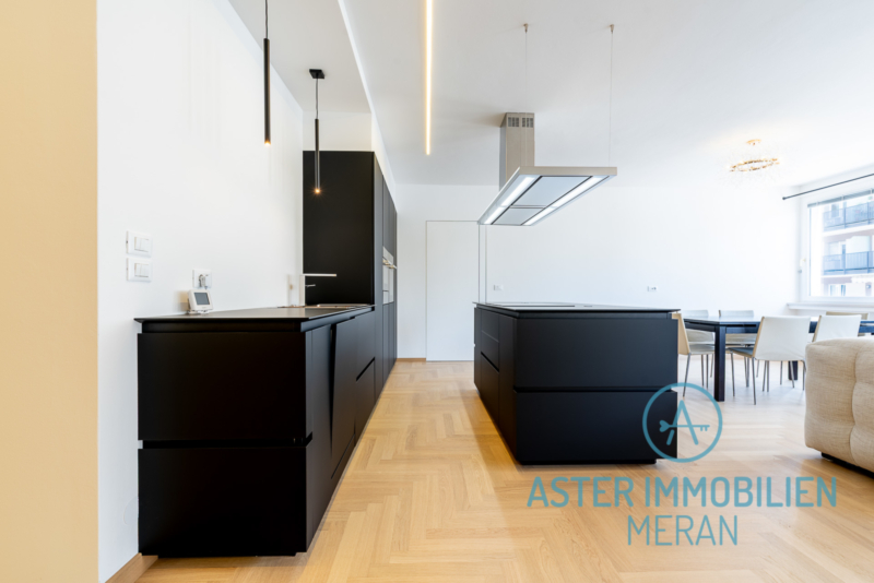 Il soggiorno e la zona pranzo a pianta aperta, con un'impressionante superficie netta di 115 m², sono il luogo perfetto per serate accoglienti e ore di relax. L'elegante cucina nera di design è completamente attrezzata con elettrodomestici di alta qualità e sarà il fulcro delle vostre creazioni culinarie. La generosa finestra frontale offre un'abbondante luce naturale e crea un'atmosfera invitante.