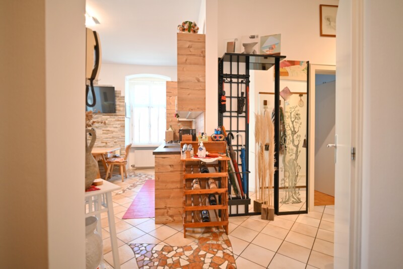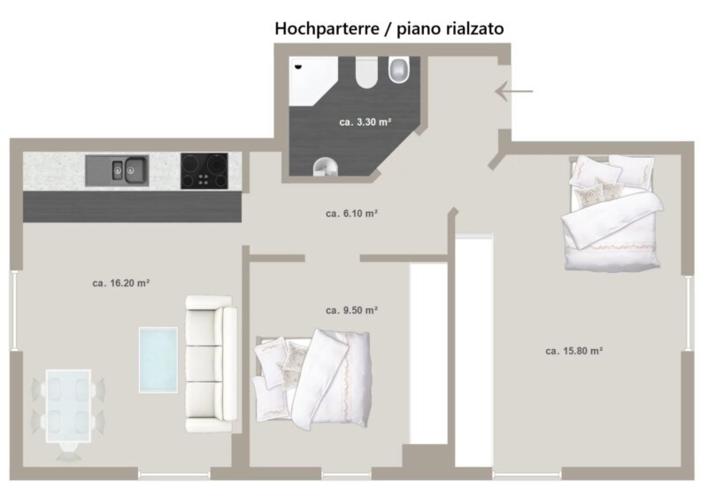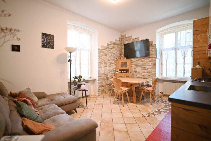 L’appartamento si trova al piano rialzato di un condominio e presenta una distribuzione degli spazi ben studiata. Il soggiorno è collegato in modo armonioso alla cucina e rappresenta il cuore dell’immobile. Una camera da letto e un ulteriore vano offrono sufficienti possibilità di privacy, mentre il bagno è funzionale e ben organizzato. Quasi tutto l’arredo resterà nell’immobile, offrendo una soluzione pronta all’uso.