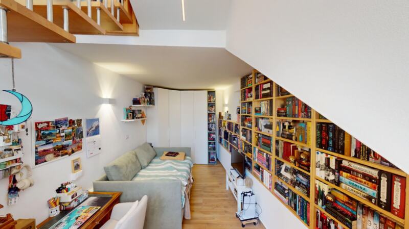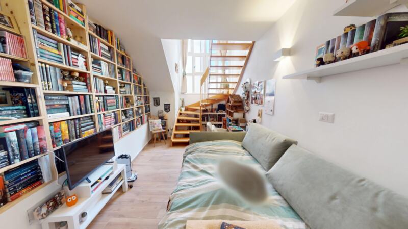 L’ingresso si trova al 1° piano, accessibile tramite scala esterna. Su questo livello si trovano la cucina e un bagno moderno con doccia e finestra. Attraverso una elegante scala a chiocciola in legno si accede al piano inferiore, dove si sviluppa l’ampia zona giorno/notte, ideale come living e area relax.