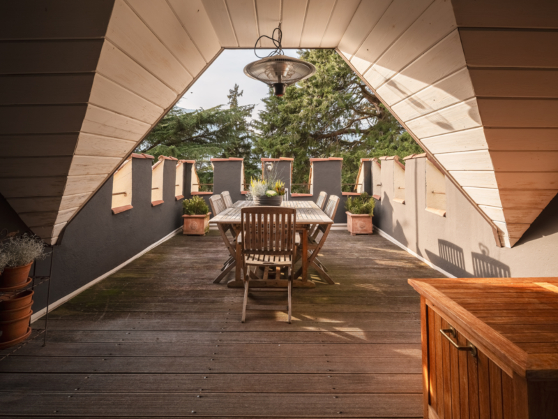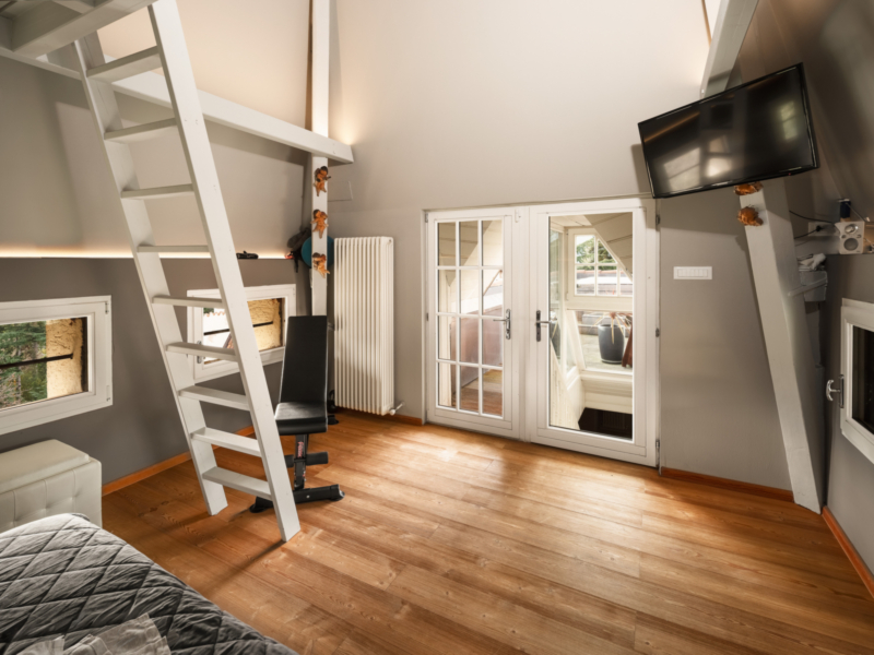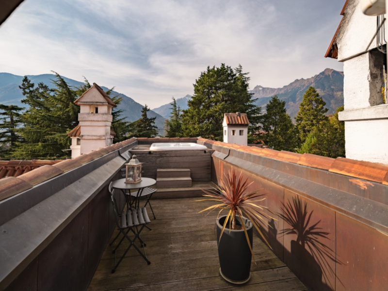 Un vero punto di forza sono le due ampie terrazze panoramiche. Una di esse ospita una vasca idromassaggio privata, ideale per momenti di relax in totale privacy con vista sulle montagne circostanti. Questo dettaglio conferisce all’immobile un carattere decisamente lussuoso e ricercato.