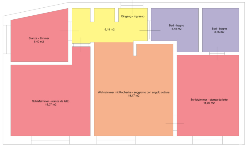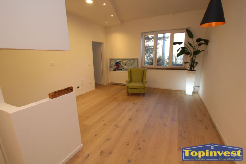 Trilocale in posizione centrale, completamente ristrutturato, 1.piano, 84 mq, suddvisi in: soggiorno con angolo cottura, 2 stanze da letto, una piccola stanza, 2 bagni, ingresso e cantina. Garage extra.