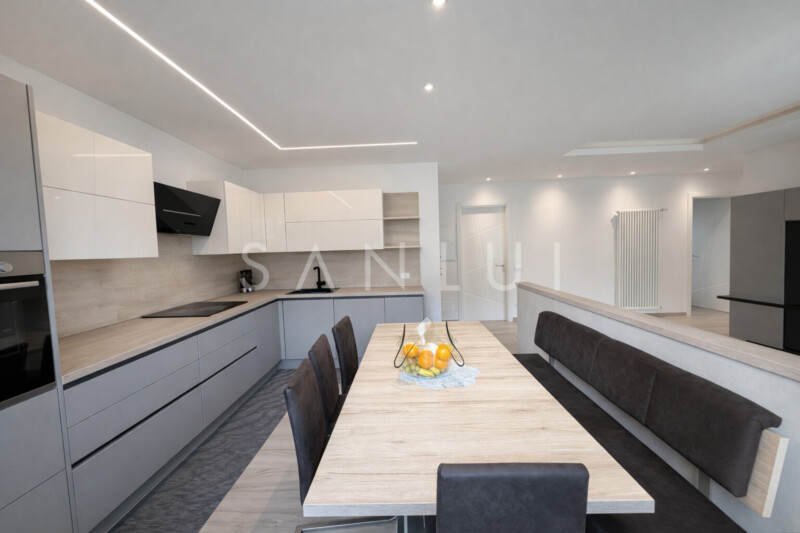 La zona giorno, luminosa grazie alle ampie superfici finestrate, offre accesso diretto alla terrazza e al giardino privato, creando un’estensione naturale dello spazio abitativo – ideale per bambini, momenti di relax o pranzi all’aperto.