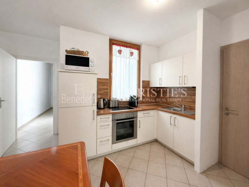 Entrando nell’appartamento si accede direttamente al corridoio, che conduce alla luminosa zona giorno. Quest’ultima dispone di un angolo cottura integrato e di un accesso a un balcone con esposizione a nord-ovest, che garantisce una piacevole luminosità.