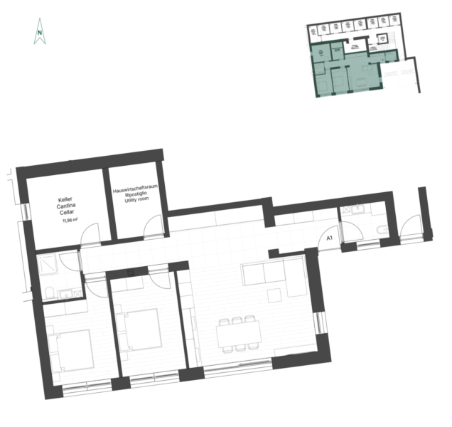 Questo spazioso trilocale è composto da una cucina abitabile, due camere da letto, due bagni, un ripostiglio e una cantina riscaldata. È possibile acquistare un posto auto a pagamento.