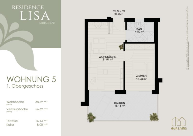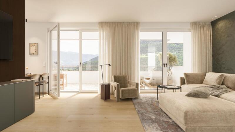 L'appartamento al primo piano offre una spaziosa cucina abitabile, una camera da letto, un bagno e un accogliente ingresso. Un’ampia terrazza invita a rilassarsi all’aria aperta e offre spazio aggiuntivo per vivere l’esterno. Grazie all’esposizione a sud e alla generosa luce solare, l’appartamento risulta luminoso, accogliente e inondato di luce naturale.