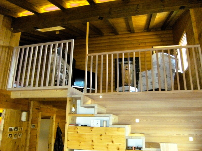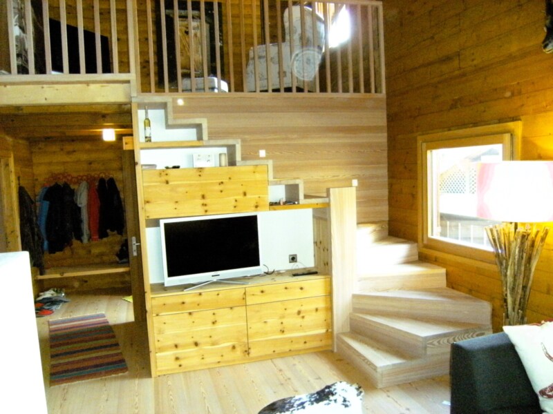 La prima unitá é arredata in stile moderno, con garage sottostante, al pianoterra soggiorno con angolo cottura, bagno, due stanze nel sottotetto ed ampio balcone e piccolo terreno attorno